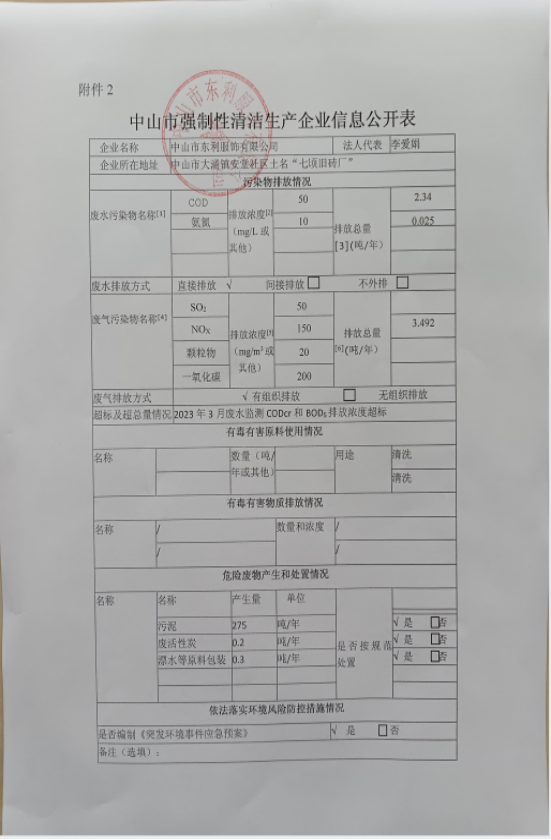 中山市東利服飾有限公司強(qiáng)制清潔生產(chǎn)公示