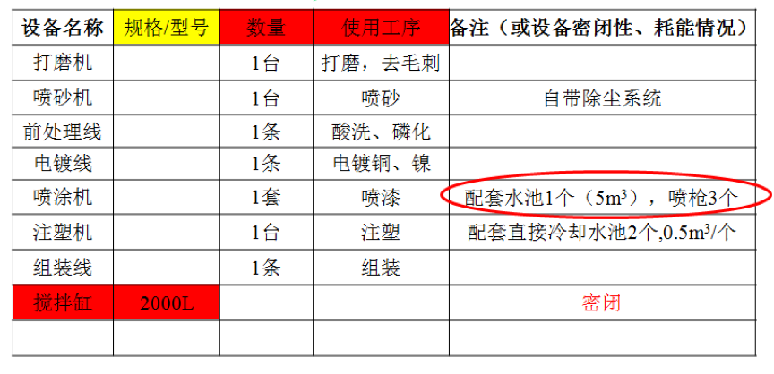 - 設(shè)備數(shù)量為“條”、“套”,都需要單列或在備注說明詳細(xì),如表格所示一套噴涂機(jī)設(shè)備包括1個(gè)配套水池和3個(gè)噴槍;