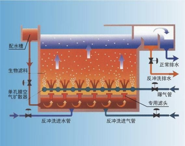 曝氣生物濾池作為集生物氧化和截留懸浮固體于一體,節(jié)省了后續(xù) 沉淀池(二沉池),具有容積負(fù)荷、水力負(fù)荷大,水力停留時間短,所需基建投資少,出水水質(zhì)好:運行能耗低,運行費用少的特點。
